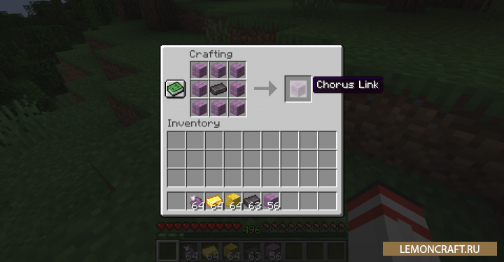 Мод на новый тип телепортации Chorus Links добавляет в игру возможность осуществлять телепортацию с использованием блоков Хоруса. Для этого вам нужно создать блок Chorus Links на который вы сможете телепортироваться употребив плод хоруса. Ести три типа плодов: простой, действует на расстоянии 64 блока, золотой на расстояние 512 блоков и зачарованный на расстояние 1024 блока.